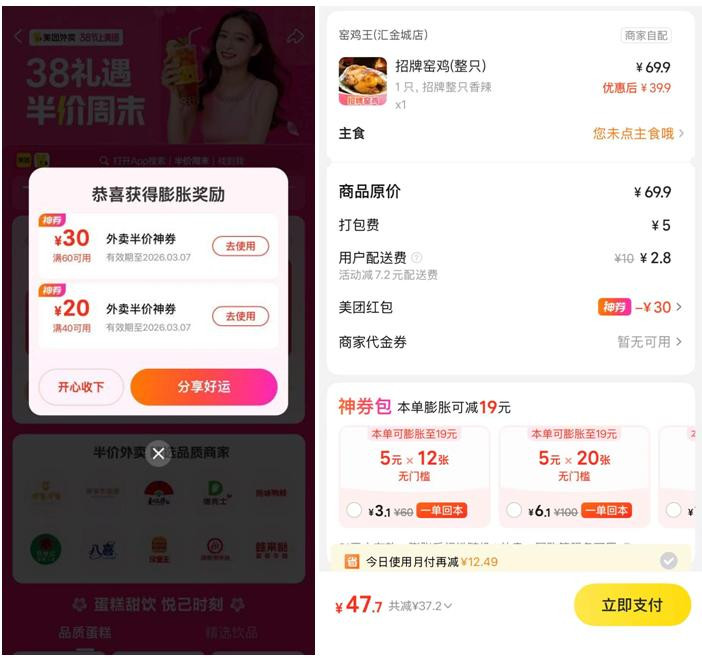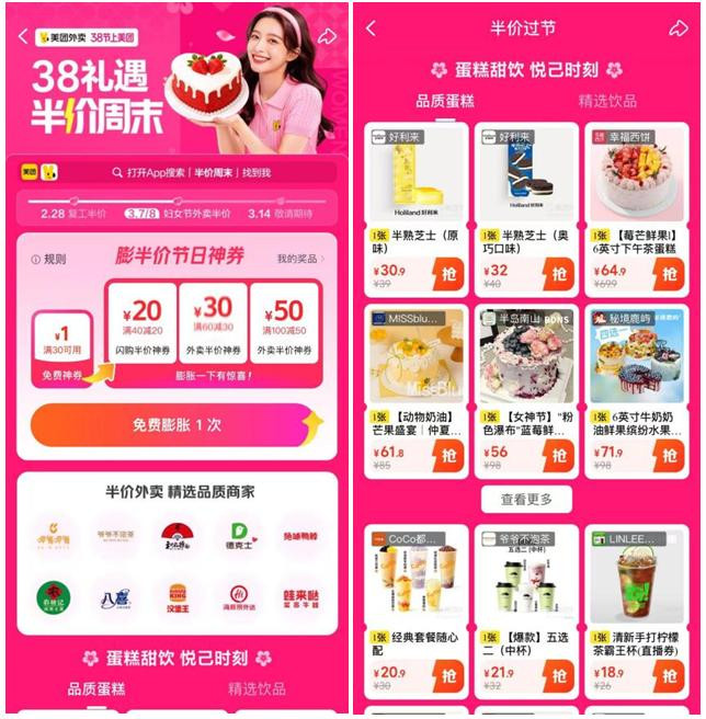 本年妇女节,好意思团外卖,为她喝彩,推出“半价狂欢,过38节”活动,超值大额半价券、超多品牌商家可用!致使还有有契机得100-50元等面额的大额半价券。