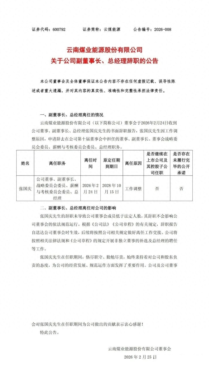 张国庆辞去云南煤业动力股份有限公司(以下简称“云煤动力”)董事、副董事长、董事会政策委员会委员、薪酬与窥伺委员会委员、总司理职务。 2月24日,云煤动力发布公告称,公司董事会于2026年2月24日收到公司董事、副董事长、总司理张国庆的书面离职评释,张国庆因责任斟酌原因,肯求辞去在公司第十届董事会中担任的董事、副董事长、董事会政策委员会委员、薪酬与窥伺委员会委员、总司理职务。 张国庆的离职未导致公司董事会成员低于法定东谈主数,其离职不会影响公司董事会的照章次第驱动。离职评释自投递公司董事会时收效。公司将按照有关法律律例和《公司规定》的规矩开展非孤独董事的补选及总司理的聘用等责任。 {jz:field.toptypename/}